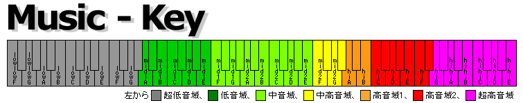 【鍵盤の説明】 「真ん中の音」と呼ばれる基準となる音は mid2A (ラの音)です。 ・・・思うに、一般的にはドの方が判りやすいですよね。音楽の授業で最初に教わるドの音は mid2C です。 自分の音域を確認する場合は「地声のみでの音域」「裏声有りの音域」と分けてチェックすることが多いですよ。 |